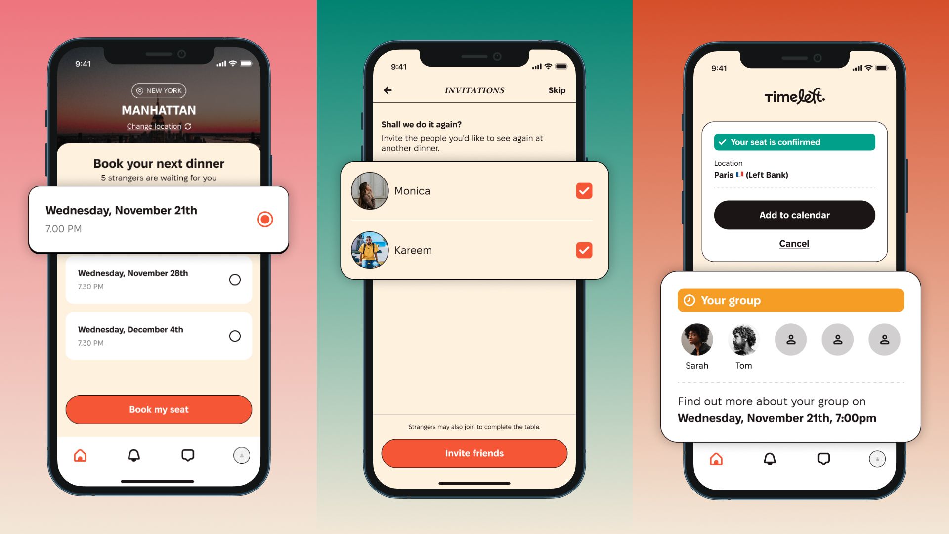 The rest of the table will be made up of new faces selected by our algorithm, just like every Timeleft dinner. If your guests accept, your dinner will include a mix of people you already know and others you'll be meeting for the first time.